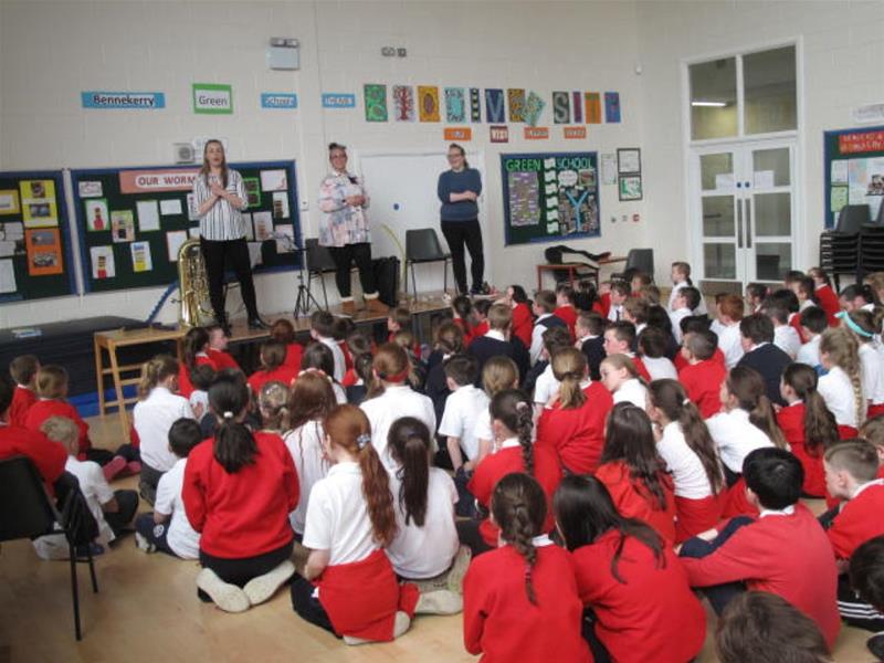 We also had a brass programme which was open to 5th and 6th class pupils. Interested students had the opportunity to play either the trumpet or trombone. These lessons took place after school and generally led to some form of performance at a point during the year. In 2018-19 the brass students took part in a collaboration with the Royal Irish Academy of Music and the Irish National Opera entitled the Popera Project. Each participating school, including Bennekerry, worked with Andrew Synnott, INO, to develop and work on the chorus of the composed opera and then their individual contribution. This was done in partnership with Gavin Barr, the MGC musician currently working in our school. The entire project culminated with a performance in the George Bernard Shaw Theatre in the middle of June.